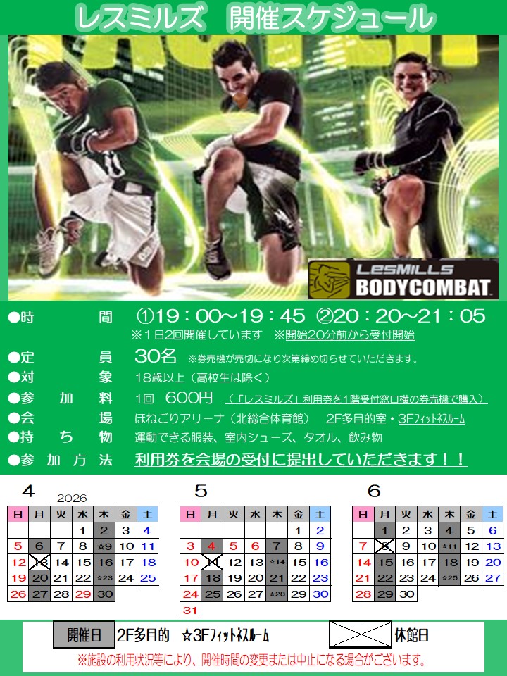 「レスミルズ ボディコンバット」とは、ボクシング・空手・ムエタイ・太極拳など、あらゆる格闘技の要素を取り入れた、最強のエアロビックエクササイズです! 新しいスタートの季節!ぜひご参加お待ちしています!