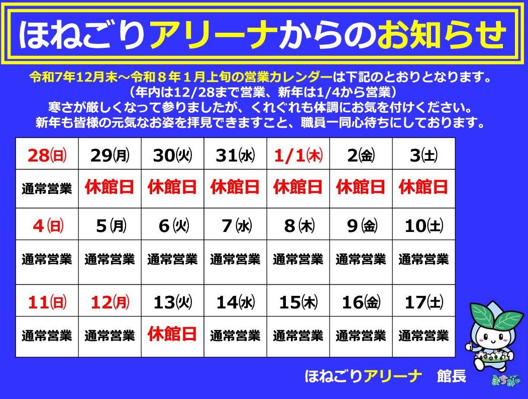 ほねごりアリーナは年内12/28まで通常営業、新年は1/4から営業を再開いたします。