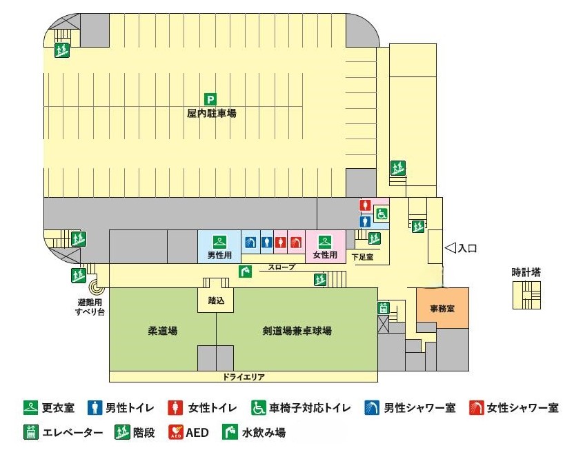 受付(事務室)、柔道場、剣道場兼卓球場のある1Fです。